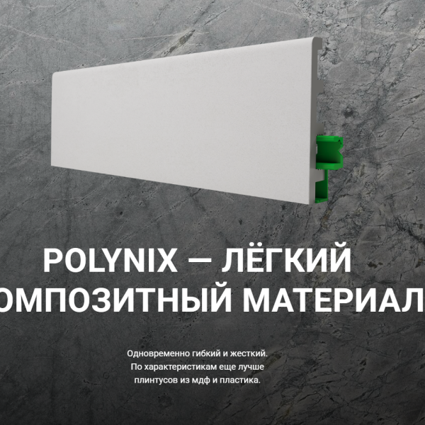 Основа плинтуса Polynix (пористый полимерный композит) производится из поливиниловых гранул с добавлением воздуха и микрокальцита, что делает материал легким, но прочным, в отличии от традиционных полимеров.