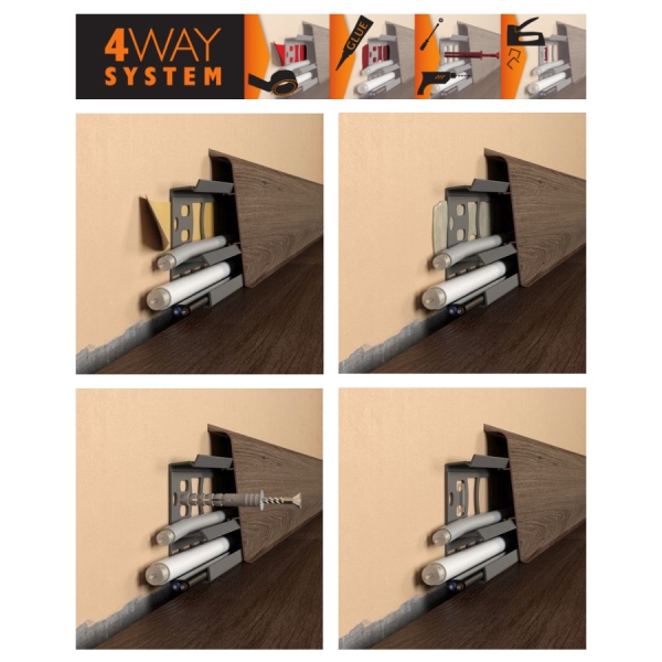 Важнейшей особенностью Arbiton Indo является отсутствие монтажного канала (нет характерных для ПВХ зазоров), благодаря чему мы получаем однородную поверхность плинтуса. Система «4 Way System», позволяет устанавливать плинтус четырьмя способами - с помощью двустороннего скотча, шурупов, скоб или клея.