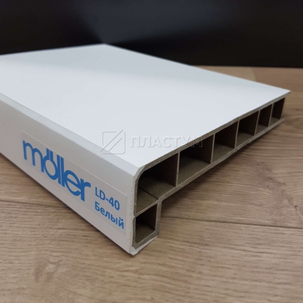 Подоконник пластиковый Moeller (Мюллер) LD 40 Белый элегант - это продукт премиум класса, имеет белоснежный цвет, слегка шероховатую и приятную на ощупь поверхность, которая хорошо защищена от загрязнений.