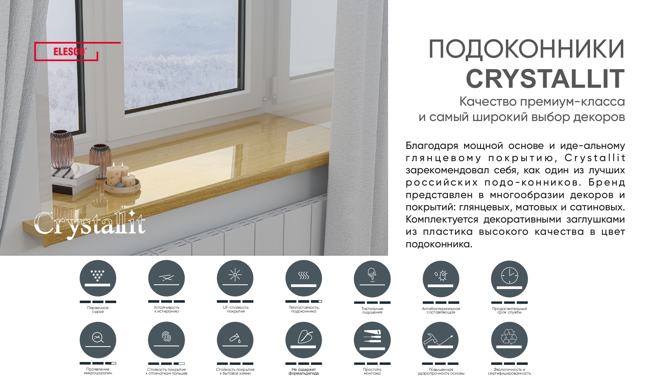 Подоконник ПВХ Crystallit (Кристаллит) — это сочетание передовых технологий, безупречного качества и уникальных производственных решений. Модель Кристаллит отличается самым толстым основанием среди аналогов на рынке и производится из экологически чистого первичного сырья.