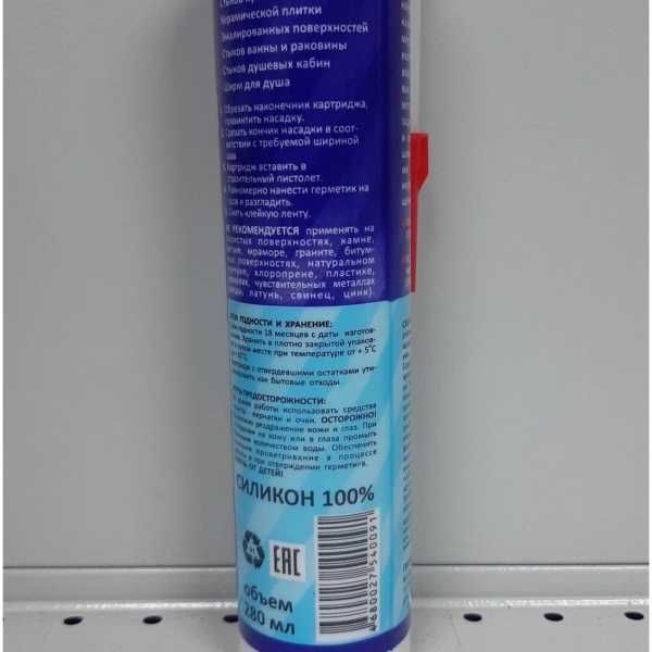 Содержит антисептическое средство, препятствующее образованию плесени. Хорошая адгезия к эмали, стеклу, дереву, металлам. Состав: силиконовый полимер, ацетоксисилан, двуокись титана, двуокись кремния, алифатические углеводороды, противогрибковая добавка.