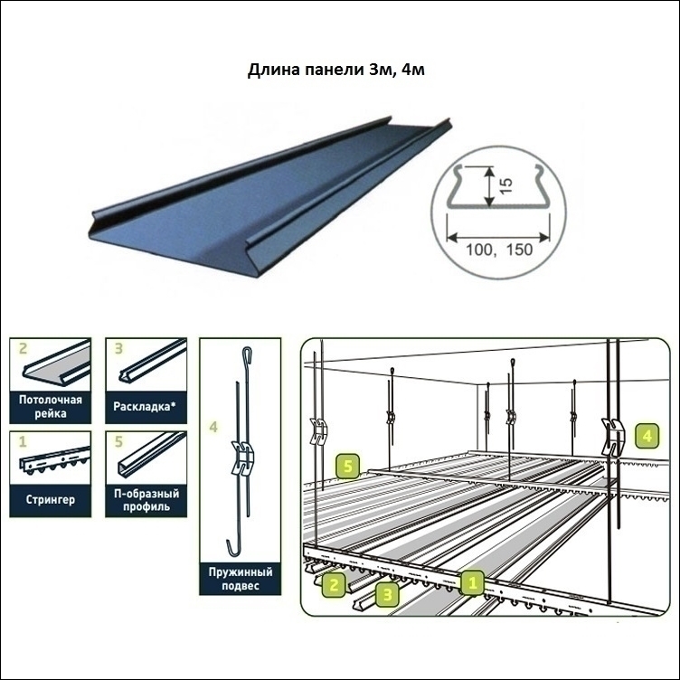 Необходимой деталью реечного потолока является П-профиль, он располагается по периметру всего помещения. Без данной детали конструкция реечного потолка невозможна.