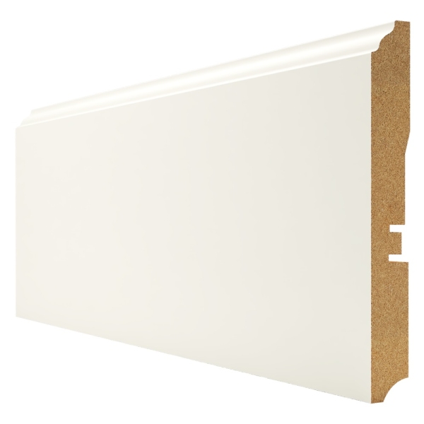 Плинтус белый напольный HANNAHHOLZ AKTUELL WEISS 301 МДФ 120 мм - покрыт специальной финишной пленкой на основе целлюлозы, а так же защитным составом на основе силикона для максимальной защиты от грязи и влаги. При желании можно использовать под покраску.