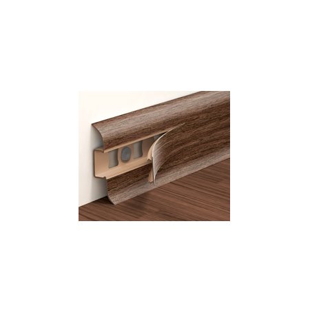 Легкосъемная планка плинтуса имеет надежную фиксацию благодаря усовершенствованной конструкции замка. Мягкий край обеспечивает плотное прилегание плинтуса к поверхностям, а также пыле – и водонепроницаемость. Долговечность плинтуса обусловлена повышенной стойкостью поверхности к влаге, истиранию и царапинам.